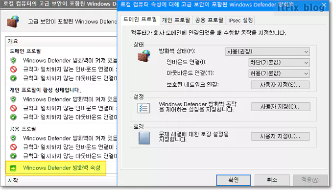 이곳에서는 윈도우 디펜더의 방화벽 속성을 변경하거나 연결 보안 규칙, 인바운드 규칙, 아웃바운드 규칙 등을 관리하고 모니터링할 수 있습니다. Windows Defender 방화벽 속성을 클릭하여 방화벽을 사용하거나 사용하지 않게 설정하는 등의 관리를 진행할 수 있습니다. 방화벽은 유해한 신호를 외부의 유입으로부터 가장 먼저 차단하는 보호장치로서 가능하면 이 기능을 꺼두지 않도록 해야 합니다.