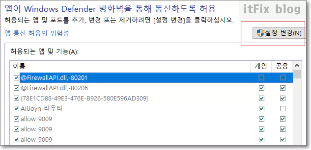 이 항목에서는 방화벽에서 허용되고 있는 목록을 보여주는 데, 위험이 우려되는 항목이 발견될 경우에는 위쪽에 있는 관리자 권한의 설정 변경 버튼을 클릭한 다음 체크 옵션을 해제할 수 있습니다.