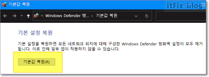 방화벽의 설정이 꼬여 있거나, 잘못된 설정이 적용된 경우에는 가장 아래쪽에 있는 방화벽 기본값 복원 버튼을 눌러 윈도우 방화벽 설정을 기본값으로 초기화할 수 있습니다.