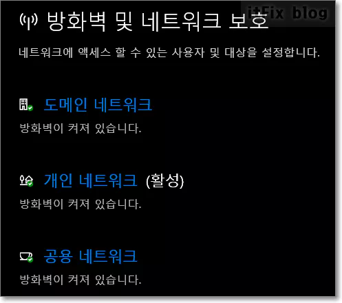 이러한 방화벽은 네트워크 형태에 따라 도메인 네트워크 또는 비지니스 네트워크, 일반 가정에서 많이 사용하는 사설 홈 네트워크인 개인 네트워크, 호텔이나 카페 또는 학교의 도서관 같은 공용 네트워크로 나눌 수 있습니다.