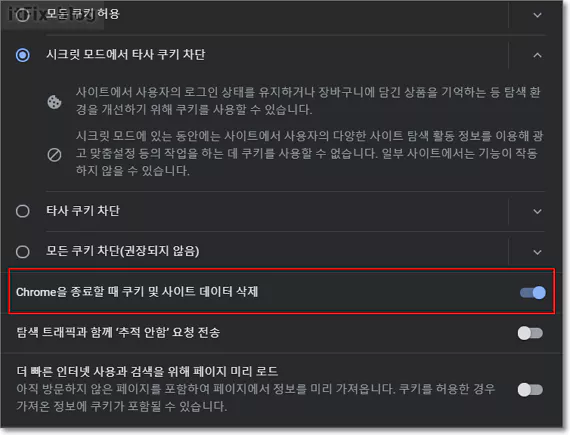 2. 크롬을 종료할 때 쿠키 및 사이트 데이터 삭제 우측의 버튼을 눌러 이 기능을 활성화합니다.