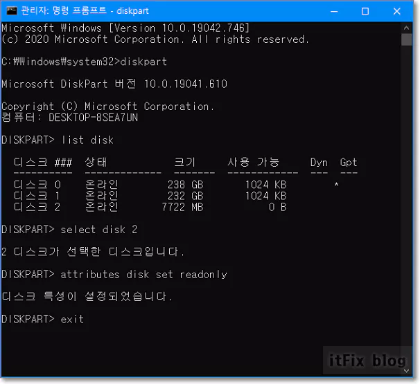- diskpart > list disk > select disk 숫자 > attributes disk set readonly > exit