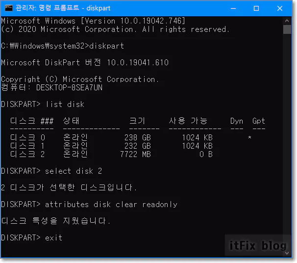 아래의 명령어를 차례대로 입력합니다. select disk 숫자에서 숫자는 쓰기 금지 옵션을 제거하는 작업을 수행할 디스크의 번호입니다. list disk 명령을 통해 해당 디스크의 번호를 볼 수 있습니다.