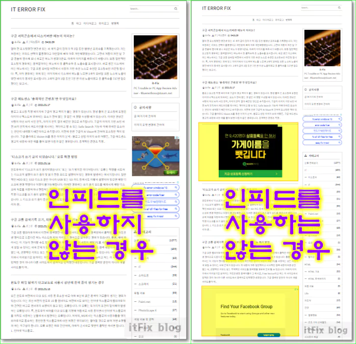 아래의 예시는 제 블로그에 인피드 광고를 설정하지 않았을 경우와 설정했을 경우에 메인 페이지에서 출력되는 전체 페이지 목록이 어떻게 표시되는지를 보여주고 있습니다.