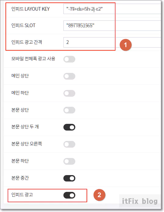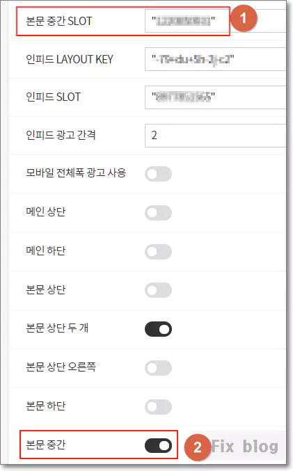 JB FACTORY 167 스킨에서는 다음과 같은 방식으로 콘텐츠 내 자동 삽입 광고 게재를 지원합니다. 구글 애드센스에서 생성한 콘텐츠 내 자동 삽입 광고 단위의 소스 코드에서 슬롯 번호를 가져와 넣은 다음 아래에서 본문 중간 광고 설정을 켜주고 스킨 변동사항을 저장하면 됩니다.