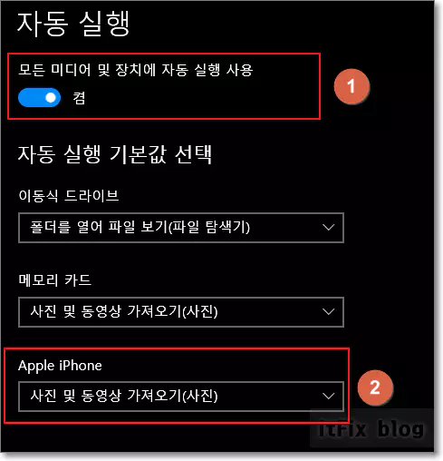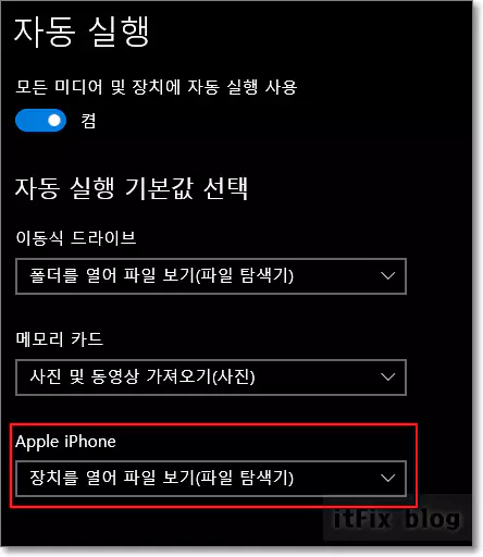 사진이 열리지 않게 하기 위한 선택지는 두 가지인데 ① 모든 USB, 메모리카드, 아이폰 등이 연결될 경우 아무 반응을 하지 않도록 자동 실행 옵션을 꺼두거나, ② 아이폰의 경우만 드롭 다운 화살표를 클릭하여 장치를 열어 파일 보기(파일 탐색기) 옵션을 선택할 수 있습니다. 이 부분은 사용자마다 호불호가 갈릴 수 있으나 편의성 측면에서 ②번을 추천합니다.