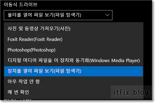 기타, 위에 있는 이동식 드라이브 또는 메모리 카드 역시 사진 및 동영상 가져오기가 아닌 폴더를 열어 파일 보기(파일 탐색기)로 설정해 두면 USB 메모리 스틱 등을 꼽고 나서 파일 탐색기에서 일일이 경로를 찾아가야 하는 수고를 덜 수 있습니다.