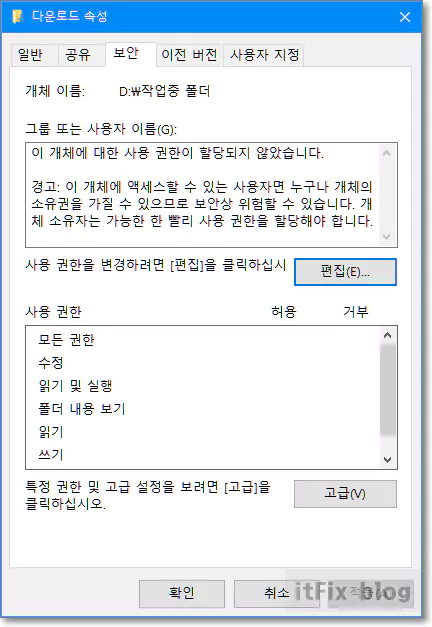 1. 권한부족 오류를 일으키는 폴더의 속성에서 보안탭으로 이동합니다.