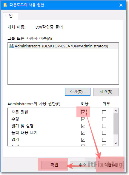 이 작업의 전에 이와 같은 방식으로 가장 상단 드라이브 속성의 보안 탭에서 먼저 Administrators에게 모든 권한을 부여하는 것이 좋습니다. 이미 부여되어 있는 경우에는 문제없지만 새롭게 부여하려고 하면 노란색 오류들이 생길 수 있으나 무시하고 계속 진행하여야 합니다. 랜섬웨어에서 암호화한 일부 폴더나 파일들로 인해 발생하는 오류로 추정됩니다.