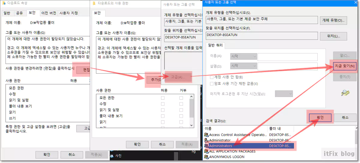 2. '편집 > 추가 > 고급 > 지금 찾기' 순서로 클릭한 다음 하단에서 Administrators를 선택하고 확인을 눌러 줍니다.