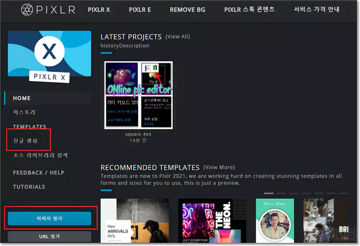 픽슬러 시작 페이지에서는 상단의 픽슬러x나 픽슬러 e를 열고 신규 생성 또는 이미지 열기 등을 이용해 작업을 시작하면 됩니다. remove bg는 일명 누끼 따는 작업이라고 알려진 배경 투명화 작업 전문 버튼입니다. 마치 포토샵의 온라인 버전 같다는 생각이 듭니다.