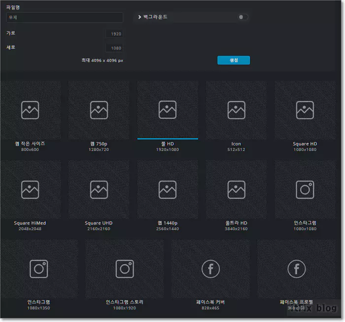 새로 만들기를 클릭하면 만들 이미지의 크기를 사용자 설정할 수 있는 것은 기본이며, 인스타그램이나 페이스북 폼 크기를 지원하고 아이콘 크기부터 울트라 HD급 크기의 폼까지 크기를 지정해 놓아 적어 넣을 필요 없이 원 클릭으로 작업 페이지를 생성할 수 있습니다.