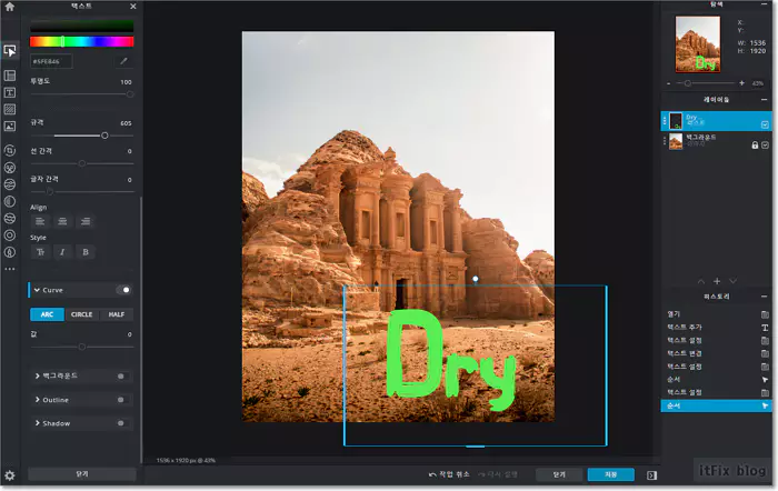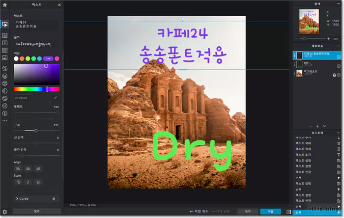 웬만한 오프라인 툴의 거의 모든 기능을 지원한다고 보면 되는 데 아래의 캡처 화면은 온라인 편집중 텍스트 레이어를 작업하는 모습입니다.