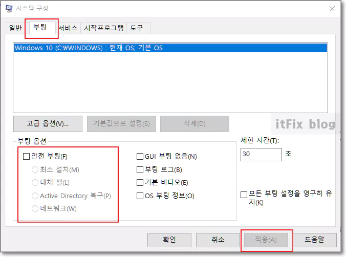 그다음 부팅 탭에서 안전 부팅에 체크 표시가 되어 있다면 해제한 다음 적용 및 확인 버튼을 누릅니다.