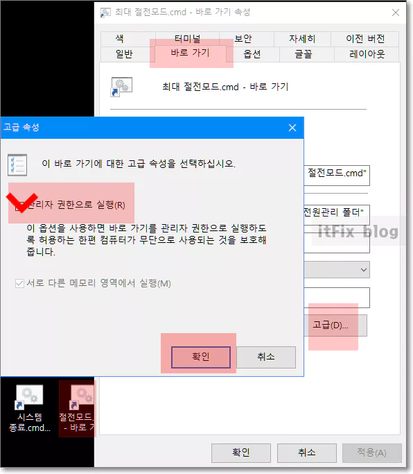 이제, 바탕화면으로 나온 4개의 바로가기 중 하나를 우클릭한 다음 속성을 누르고 바로 가기 탭을 선택한 다음 하단의 고급 버튼을 눌러 관리자 권한 부여에 체크해주고 적용 및 확인 버튼을 눌러 줍니다.