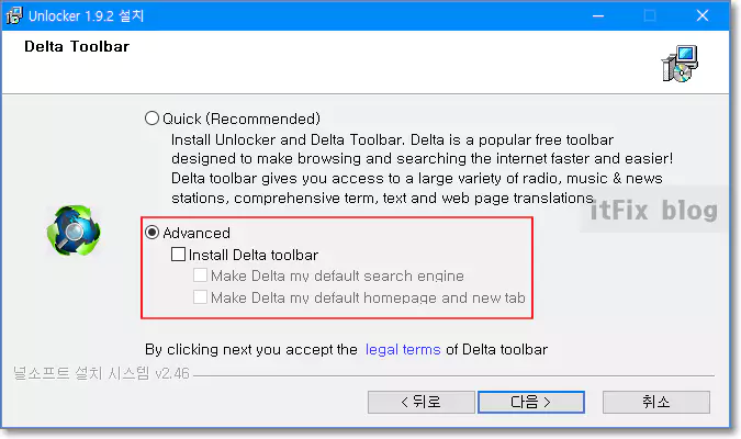 설치 과정 중 Advanced를 선택하여 툴바 설치는 체크를 해제하여 깔끔하게 단일 프로그램만 설치합니다.