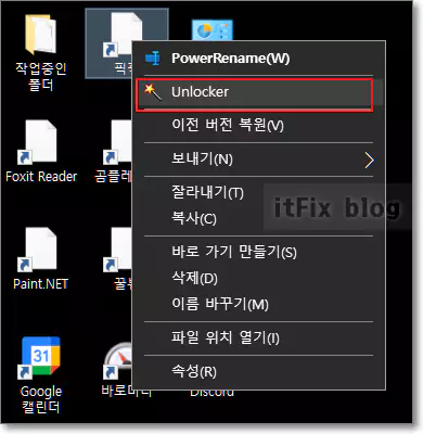 설치가 끝난 다음 삭제하고자 하는 파일을 마우스 우클릭한 다음 마법봉 그림이 있는 Unlocker를 클릭합니다.