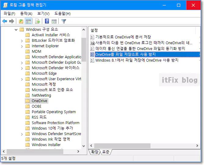 우측의 내용 중 Onedrive를 파일 저장소로 사용 방지를 더블 클릭한 다음 기본값인 구성되지 않음을 사용 안 함으로 변경한 다음 확인을 눌러 줍니다.
