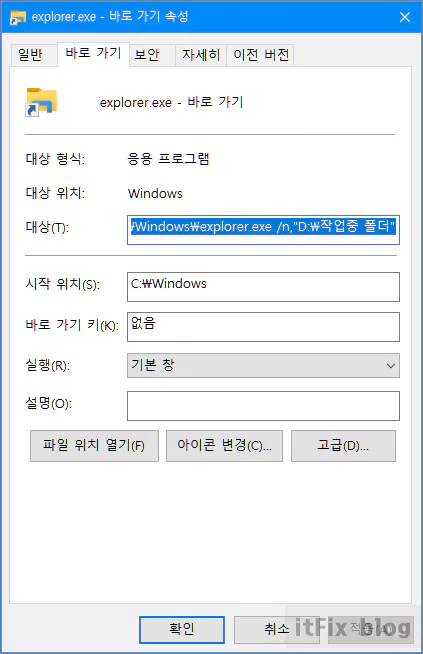 C:\Windows\explorer.exe /n,D:\작업중 폴더