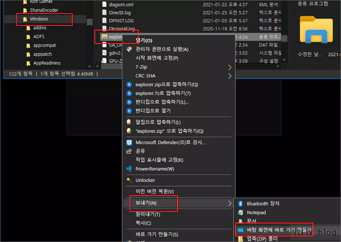 파일 탐색기를 열고 C:\Windows 경로로 들어가면 explorer.exe 파일이 있는 데 이 파일이 탐색기 파일입니다. 이 파일을 마우스 우클릭한 후 보내기 > 바탕화면에 바로 가기 만들기를 클릭합니다.