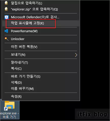바탕화면에 있는 제작한 파일 탐색기 바로 가기 아이콘을 우클릭한 다음 '작업 표시줄에 고정'을 선택합니다.