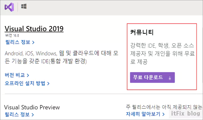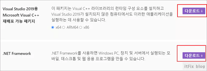 위의 다운로드 페이지를 아래로 스크롤해서 내리면 '기타 도구 및 프레임 워크'가 보입니다. 클릭한 다음 Visual Studio 2019용 Microsoft Visual C++ 재배포 가능 패키지와 .NET Framework를 설치해 줍니다.