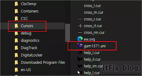 파일 탐색기를 열고 방금 다운로드한 gam1571.ani 파일을 C:\Windows\Cursors 폴더로 복사해서 이동시켜 줍니다.