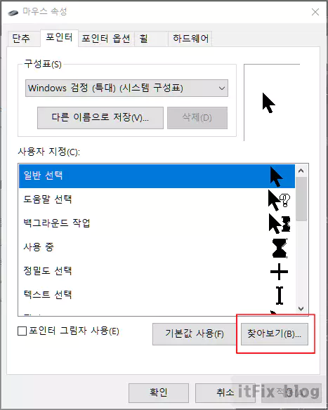 마우스 커서를 원하는 테마 또는 모양으로 지정해 두었지만 재부팅하면 초기화되거나 기본형으로 바뀌는 경우가 있습니다. 커서 테마 관련 설정은 윈도우 제어판의 마우스에서 할 수 있습니다.