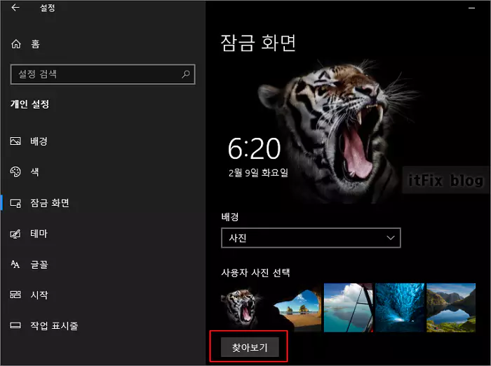 윈도우 설정 > 개인 설정 > 잠금 화면으로 이동한 다음 Windows 추천으로 되어 있는 잠금 화면 설정을 클릭하여 사진으로 바꿉니다. 그러면 바로 아래쪽에 찾아보기 버튼이 생기는데 조금 전 Pxhere 사이트에서 받아둔 이미지를 지정해 줍니다.