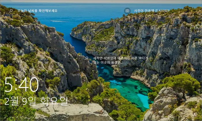 평상시의 잠금화면은 윈도우에서 자동으로 일정 시간마다 교체해 주는 이미지로 설정되어 있어 아래와 같은 모습을 하고 있습니다. 즉시 잠금 단축키인 윈도우 로고키+L키를 눌러보면 현재 이미지를 확인할 수 있습니다.