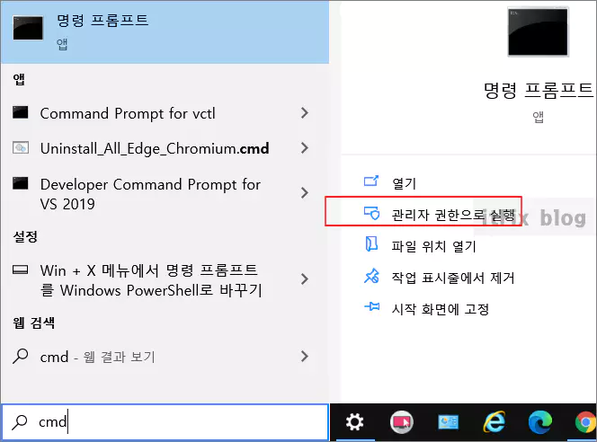 윈도우 작업 표시줄의 검색 상자에 cmd라고 입력한 다음 관리자 권한으로 명령 프롬프트를 실행합니다.