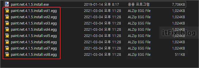 아래의 그림은 알집을 이용해 임의의 파일을 우클릭하여 1MB씩 나누어지도록 egg 포맷으로 분할 압축한 모습입니다.
