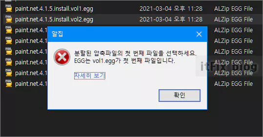 따라서, 만일 Vol 2번 파일의 압축을 해제하려고 할 경우에는 오류 메시지가 출력되면서 압축을 풀 수 없게 됩니다.