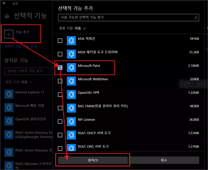 이번에는 선택적 기능 페이지의 위쪽에 있는 기능 추가 플러스 표시를 누르고 팝업 항목에서 Microsoft Paint 항목에 체크 표시를 한 다음 설치 버튼을 눌러 줍니다. 이와 같이 하면 제거되었던 그림판이 다시 설치되게 됩니다.