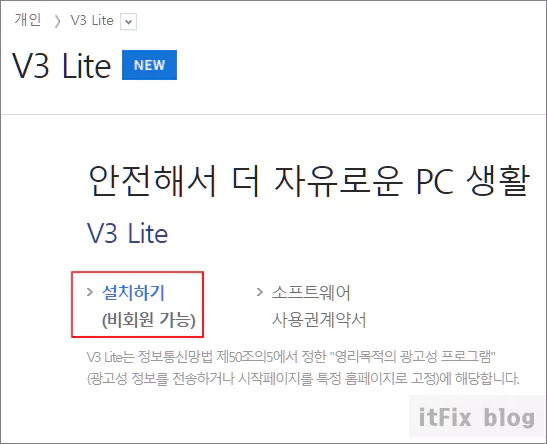 안랩의 설치 파일 다운로드에 있는 설치하기 링크를 눌러 최신 파일을 다운로드하고 설치합니다.