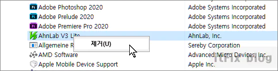 설치가 완료되었다면 제어판으로 이동한 후 프로그램 추가 및 제거에서 V3 Lite를 제거합니다. 이후 재부팅하여 문제가 해결되었는지 관찰합니다.