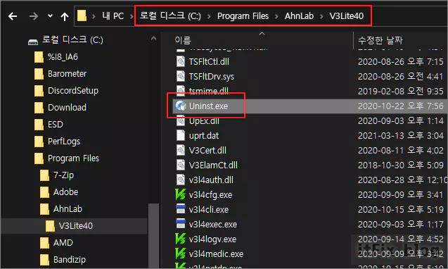 안랩의 프로그램들은 거의 모두 'C:\Program Files\AhnLab'이 기본 설치 경로로 되어 있습니다. 파일 탐색기를 열고 해당 경로로 이동한 다음 V3Lite40 폴더를 더블 클릭하여 내용물을 열어 봅니다. 존재하는 파일들 중 Unist.exe 파일이 프로그램 제거 파일이므로 이 파일을 더블 클릭하여 V3 Lite를 제거합니다.