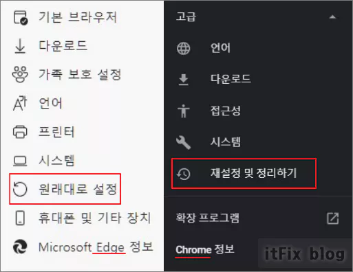 - 위의 자동완성 해제로도 오류가 해결되지 않는 경우에는 오류를 일으키고 있는 브라우저의 초기화를 진행해 봅니다. 크롬은 설정의 고급에서 재설정을, 엣지는 설정에서 원래대로 설정을 클릭하면 됩니다.