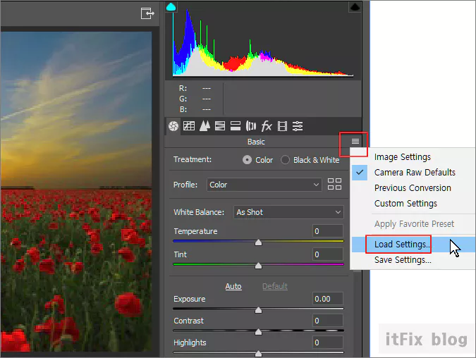 이와 같이 포토샵에서는 사용자 설정된 xmp 파일을 불러와 적용할 수 있는 데, 기본 xmp 저장 디렉토리는 C:\ Users\ 계정명\ AppData\ Roaming\ Adobe\ CameraRaw\ Settings 입니다.