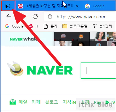 이렇게 되면 탭 리스트는 세로로만 출력이 되고 기존의 가로축 상단은 마치 하나의 탭만 열려 있는 것 처럼 깔끔하게 유지됩니다. 이상태에서 세로 탭 리스트 목록을 아이콘만 보이게 할 수도 있습니다. 탭 목록 우측 상단의 화살표를 클릭하면 세로 탭 리스트가 간략하게 아이콘으로만 표시됩니다.