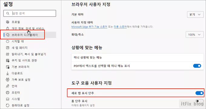 마지막으로 세로탭을 사용하지 않기 위해 아예 새로운 세로 탭 기능을 보이지 않게 하고, 새로운 사각형의 세로 탭 아이콘 역시 나타나지 않게 하려면 엣지의 설정 > 브라우저 디스플레이에서 '세로 탭 표시 단추' 항목을 끄면 됩니다.