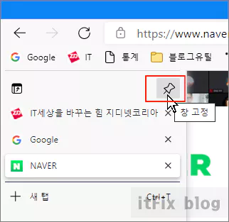 세로 탭을 고정하여 계속 세로 탭이 열려있는 상태로 엣지를 사용하고자 할 경우에는 세로 탭을 연 다음 고정 핀 아이콘을 눌러 고정하면 엣지를 열 때는 항상 세로 탭으로 열리게 됩니다.