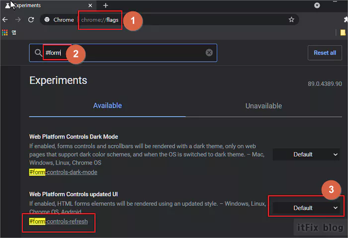 이 문제를 해결하려면 크롬의 주소창에 chrome://flags를 입력한 다음 검색창에 #form을 타이핑 하면 거의 동시에 아래쪽으로 #form으로 시작하는 두 가지 옵션을 보여줍니다. 둘 중 아래쪽에 있는 #form-controls-refresh 항목의 우측 옵션을 Default에서 Disabled로 바꾼 다음 열려 있는 모든 크롬 창을 재시작하기 위해 아래쪽에 있는 Relaunch 버튼을 눌러 줍니다.