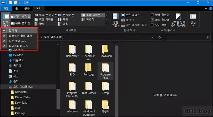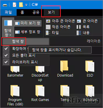 탐색기 상단의 메뉴중 보기 탭을 누릅니다. 그다음 가장 왼쪽에 존재하는 탐색 창 아이콘의 화살표를 클릭하여 드롭다운 메뉴에서 탐색 창이 체크 표시되도록 클릭하여 선택해 줍니다.