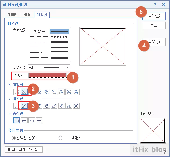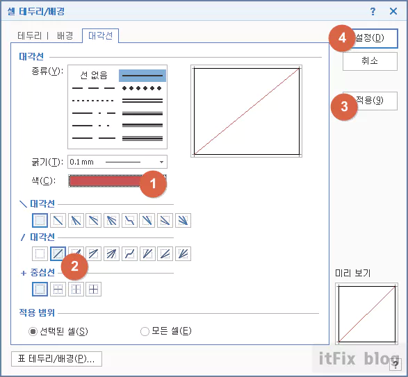 3. 대화상자가 팝업 되면 대각선 탭을 선택한 다음 색상, 대각선 종류를 선택한 다음 적용 및 설정 버튼을 누릅니다.