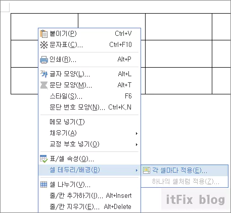 2. 첫번째 셀에서 커서가 깜빡이는 상태에서 마우스 우클릭하여 셀 테두리/배경 > 각 셀마다 적용을 클릭합니다.