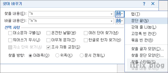 찾아 바꾸기 대화 상자가 열리면 찾을 내용 끝에 있는 쌍안경 아이콘을 눌러 문단 끝을 선택해 줍니다.