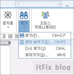 위의 문장을 드래그하여 전체 선택한 다음 편집 메뉴에 있는 쌍안경 모양 아이콘을 누르고 '찾아 바꾸기'를 클릭합니다.
