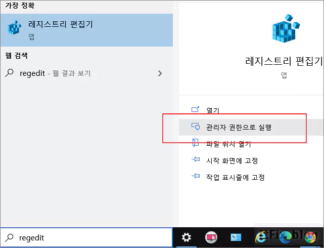 작업 표시줄의 검색 상자에 regedit라고 입력한 다음 레지스트리 편집기를 관리자 권한으로 실행합니다.