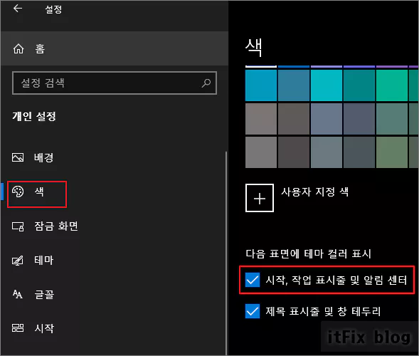 이 옵션은 알림 영역과 작업 표시줄, 윈도우 시작 메뉴가 함께 작동하는 색상 옵션이므로 3가지가 항상 함께 색상 변경을 일으킵니다. 어느 하나만 변경시키는 것은 불가능합니다.